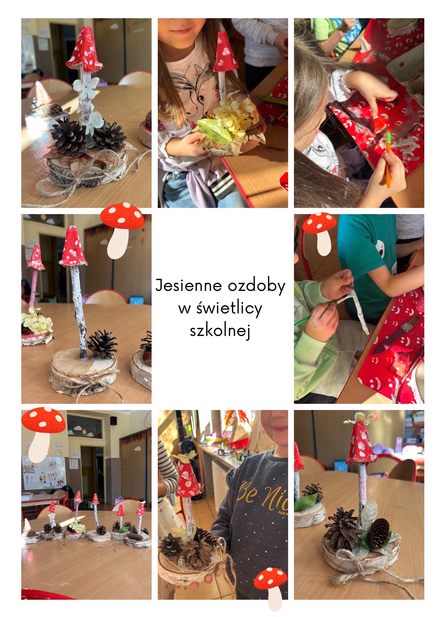 W świetlicy dzieci tworzyły jesienne grzyby z materiałów recyklingowych. Najpierw przykleiły patyczki do krążków drewna, a następnie dodały kapelusze z wydmuszek po jajkach. Praca sprawiła im mnóstwo radości, a efekt przeszedł wszelkie oczekiwania!