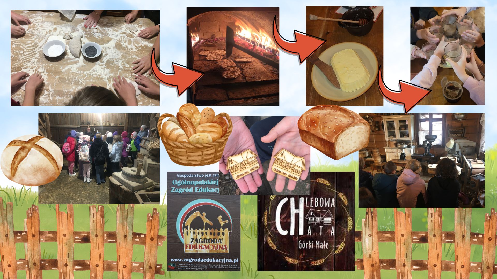 Dzień 12 listopada uczniowie klasy IIIa i IIIb spędzili na warsztatach edukacyjnych w Chlebowej Chacie Górki Małe. Po interesujących pokazach dawnych narzędzi i maszyn rolniczych oraz wyposażenia wiejskiej chaty i pszczelarskiej prelekcji dzieci własnoręcznie wyrabiały ciasto i wypiekały podpłomyki w chlebowym piecu. Można je było degustować z dodatkiem przygotowanego w zagrodzie masła, miodu, smalcu i kawy zbożowej.