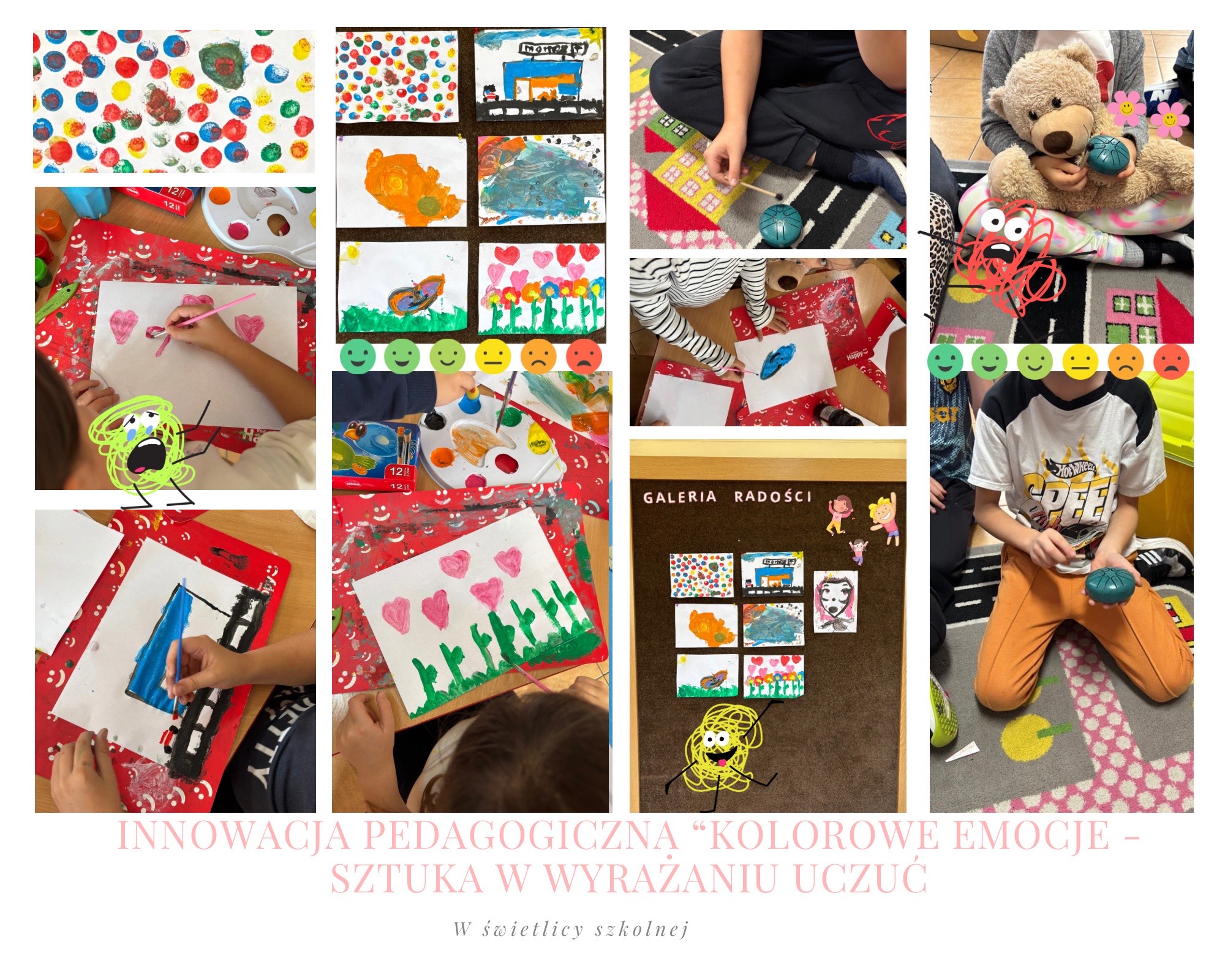 W świetlicy szkolnej rozpoczęliśmy realizację innowacji pedagogicznej „Kolorowe emocje – sztuka w wyrażaniu uczuć”. Celem działań jest wspieranie rozwoju emocjonalnego dzieci poprzez sztukę. Zajęcia plastyczne stają się okazją do rozmów o uczuciach, wymiany doświadczeń i budowania wzajemnego zrozumienia. Dzieci tworzą, obserwują i dzielą się swoimi przeżyciami, ucząc się otwartości oraz empatii. Pierwszym tematem była radość. Podczas zajęć uczniowie siedzieli w kręgu, grali na bębnie językowym i opowiadali o tym, co sprawia im przyjemność oraz w jakich chwilach czują się szczęśliwi. Następnie każdy namalował swoją własną „radość”, a w tle rozbrzmiewały wesołe melodie. Tak powstała Świetlicową Galeria Radości.