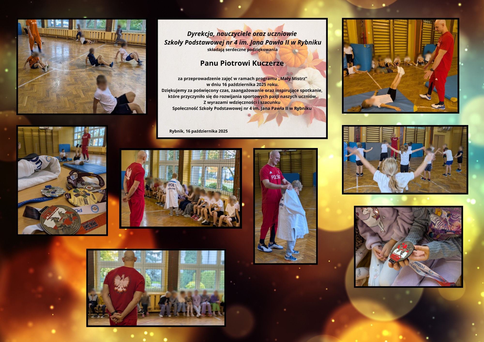 16 października 2025 roku uczniowie klas 2a i 3a wzięli udział w wyjątkowych zajęciach sportowych z Mistrzem Piotrem Kuczerą – zawodnikiem i trenerem judo z Rybnika. Spotkanie odbyło się w ramach programu „Mały Mistrz”, którego celem jest zachęcanie najmłodszych do aktywności fizycznej oraz poznawania różnych dyscyplin sportu.