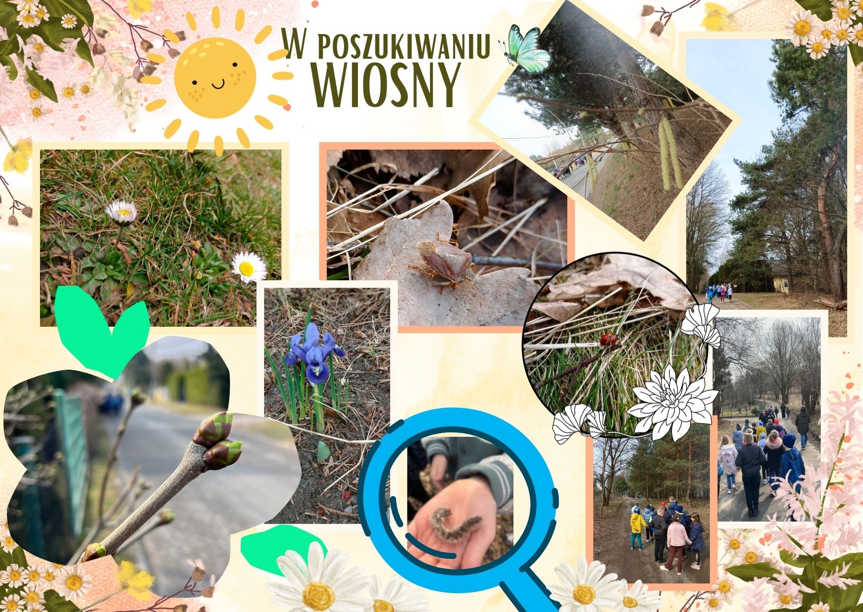 Klasy pierwsze wyruszyły na poszukiwanie pierwszych oznak wiosny, pełne entuzjazmu i ciekawości. Podczas spaceru po pobliskim lesie uczniowie uważnie obserwowali przyrodę, wypatrując zwiastunów nadchodzącej pory roku. Z radością dostrzegali pierwsze pąki na drzewach, delikatnie przebijające się przez ziemię kwiaty, owady i śpiew powracających ptaków. Każde nowe odkrycie wywoływało uśmiechy na ich twarzach i było okazją do rozmów o budzącej się do życia naturze. Po zakończeniu poszukiwań przyszedł czas na wspólne zabawy na świeżym powietrzu.