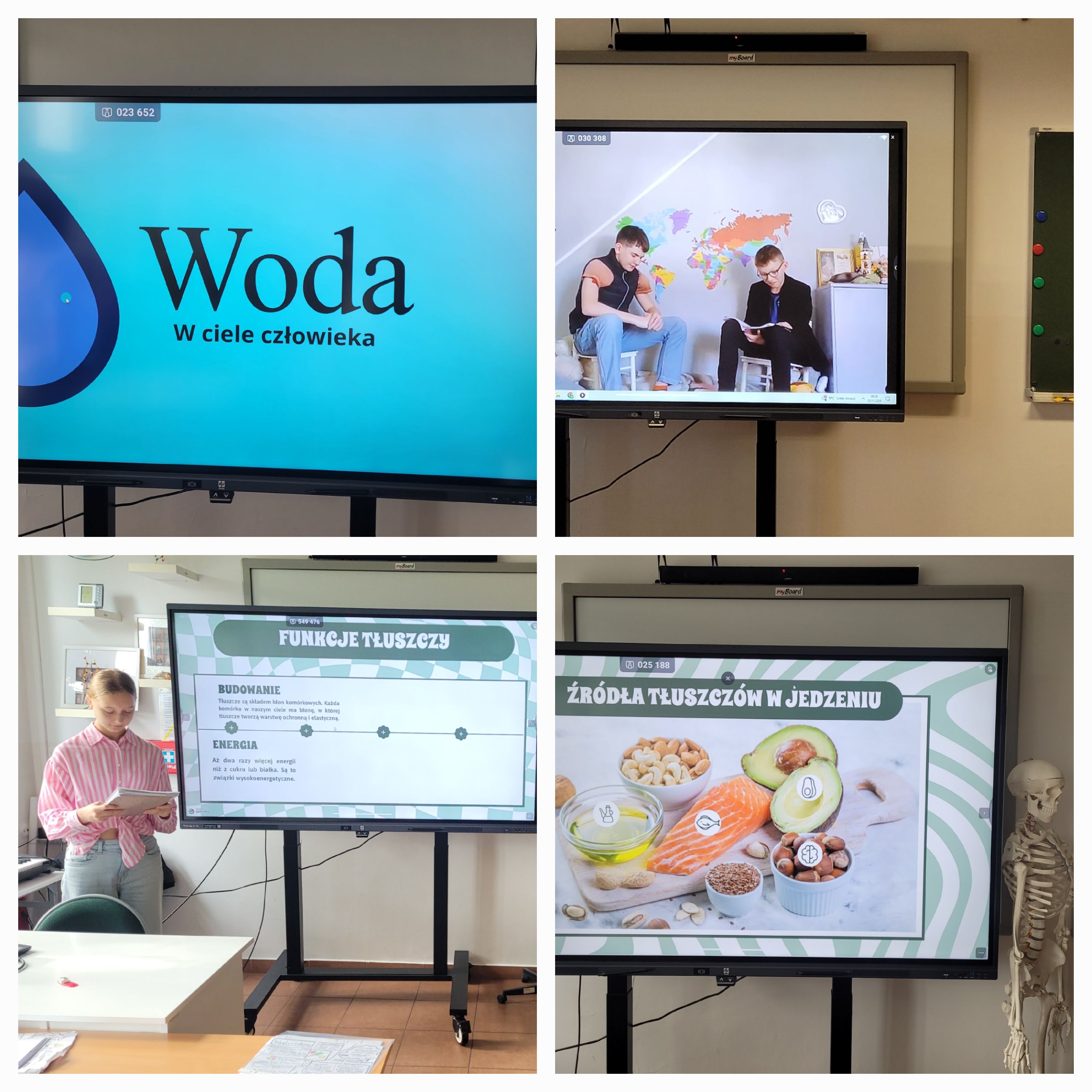Uczniowie podzieleni na grupy opracowywali zagadnienia dotyczące białek, tłuszczów, węglowodanów, witamin, wody i soli mineralnych.