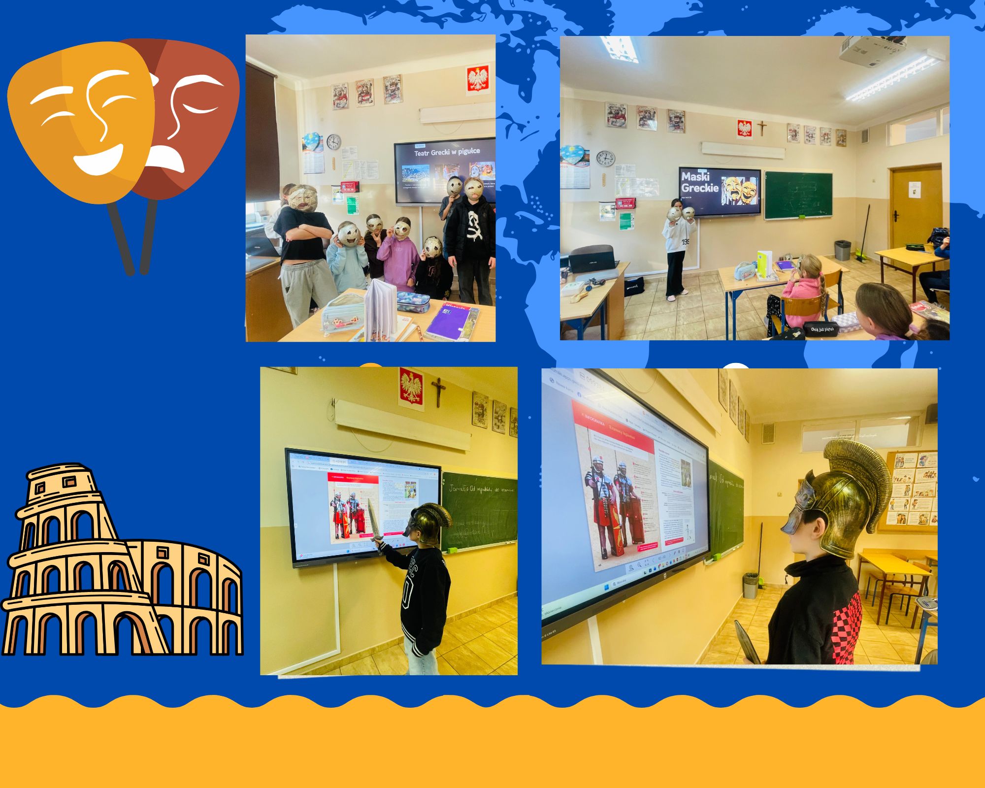 W listopadzie uczniowie klas piątych uczestniczyli w wyjątkowych, żywych lekcjach historii. Cześć zajęć odbyła się w ramach innowacji „Historia przez sztukę”, która łączy naukę z twórczym doświadczeniem. Uczniowie przenieśli się w wyobraźni do starożytnego teatru greckiego, poznając jego znaczenie w kulturze. Następna lekcja ukazała im świat antycznego Rzymu i życie legionistów. Mogli dokładnie obejrzeć i omówić wyposażenie rzymskich żołnierzy, a także sami założyć niektóre akcesoria z tamtych czasów. Dzięki tej formie zajęć historia stała się fascynującą podróżą w czasie, rozwijającą wiedzę i wyobraźnię.