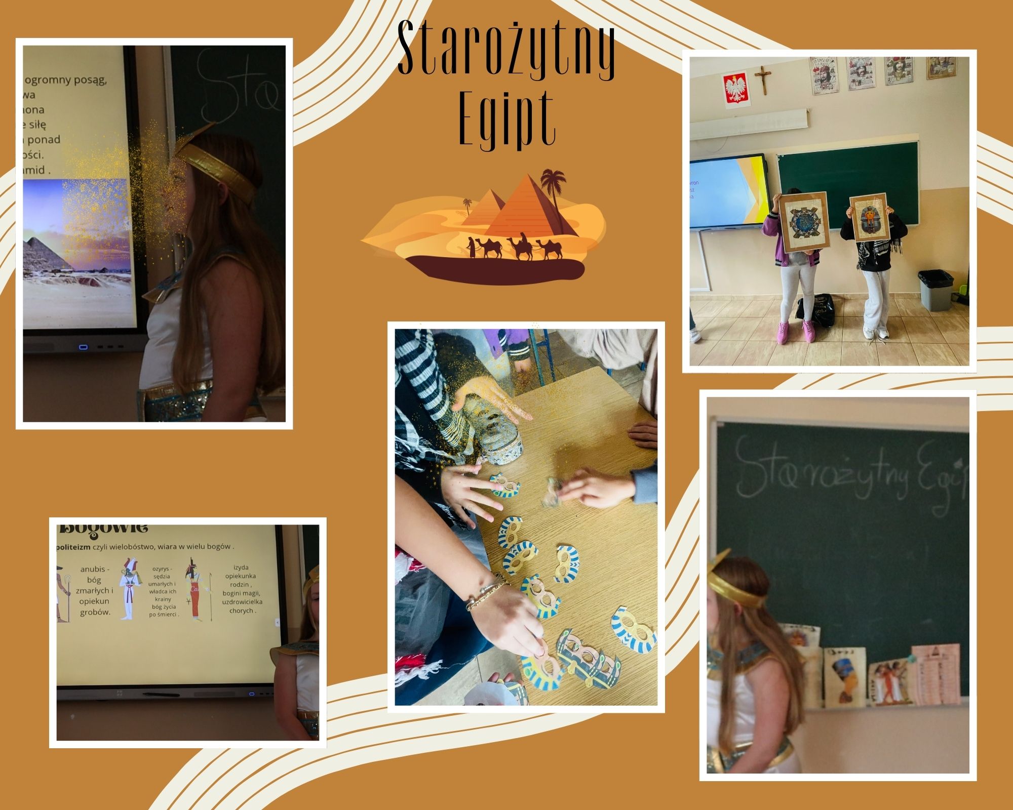 Uczniowie klas piątych w ramach innowacji „Galeria Epok – historia przez sztukę” przygotowali prezentację poświęconą starożytnemu Egiptowi. Z dużym zaangażowaniem przedstawili najważniejsze informacje o tej cywilizacji, obejmujące kulturę, religię, budowę piramid oraz życie codzienne. Dzieci zaprezentowały stroje Egipcjan, wzorowane na historycznych źródłach. W tle prezentacji rozbrzmiewała muzyka inspirowana motywami egipskimi, która wprowadzała uczestników w klimat epoki. Uczniowie pokazali także obrazy namalowane na płótnie oraz autentyczne pamiątki przywiezione z Egiptu. Całość wydarzenia miała charakter edukacyjno-artystyczny i była wyrazem twórczego podejścia do nauki historii.